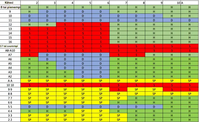 H – HIT(LISÄÄ), S – STAND(JÄÄ), D – DOUBLE(TUPLAA) SP – SPLIT(JAA)